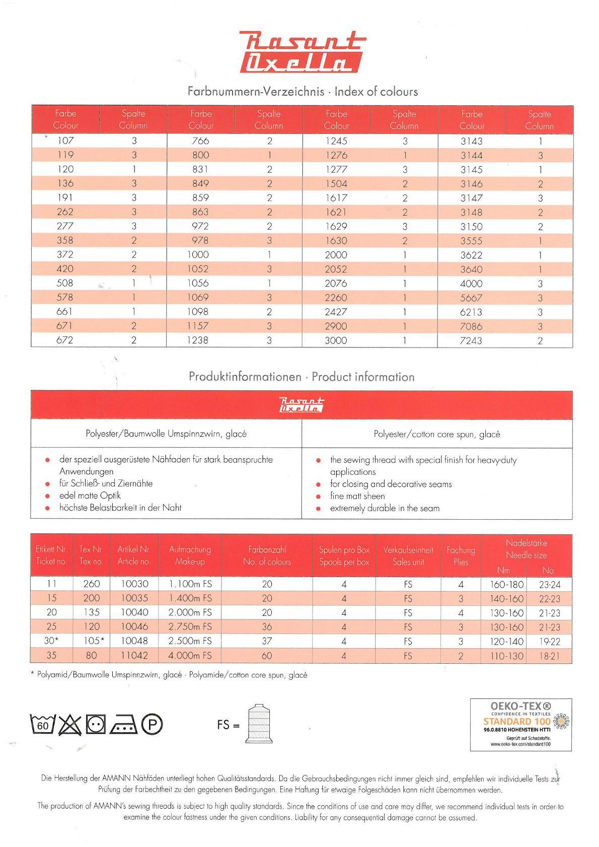 Amann Farbkarte, Garn Rasant Oxella, mit allen Garnstärken und verfügbaren Farben