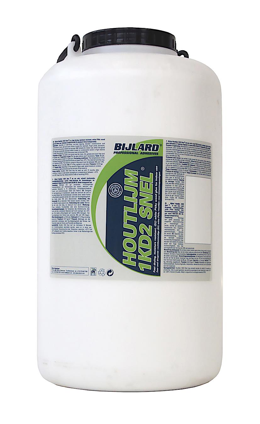 Bijlard Holzleim Schnell 1KD2 SNEL, 10 kg A12, weiß, Sehr schnell trocknender, feuchtigkeitsbeständiger, weißer PVAc-Holzleim für Anwendungen im Innenbereich. Entspricht der Norm NEN-EN 204 D2. Härtet transparent aus. Öffnungszeit ± 5 Minuten. Presszeit 5-10 Minuten.