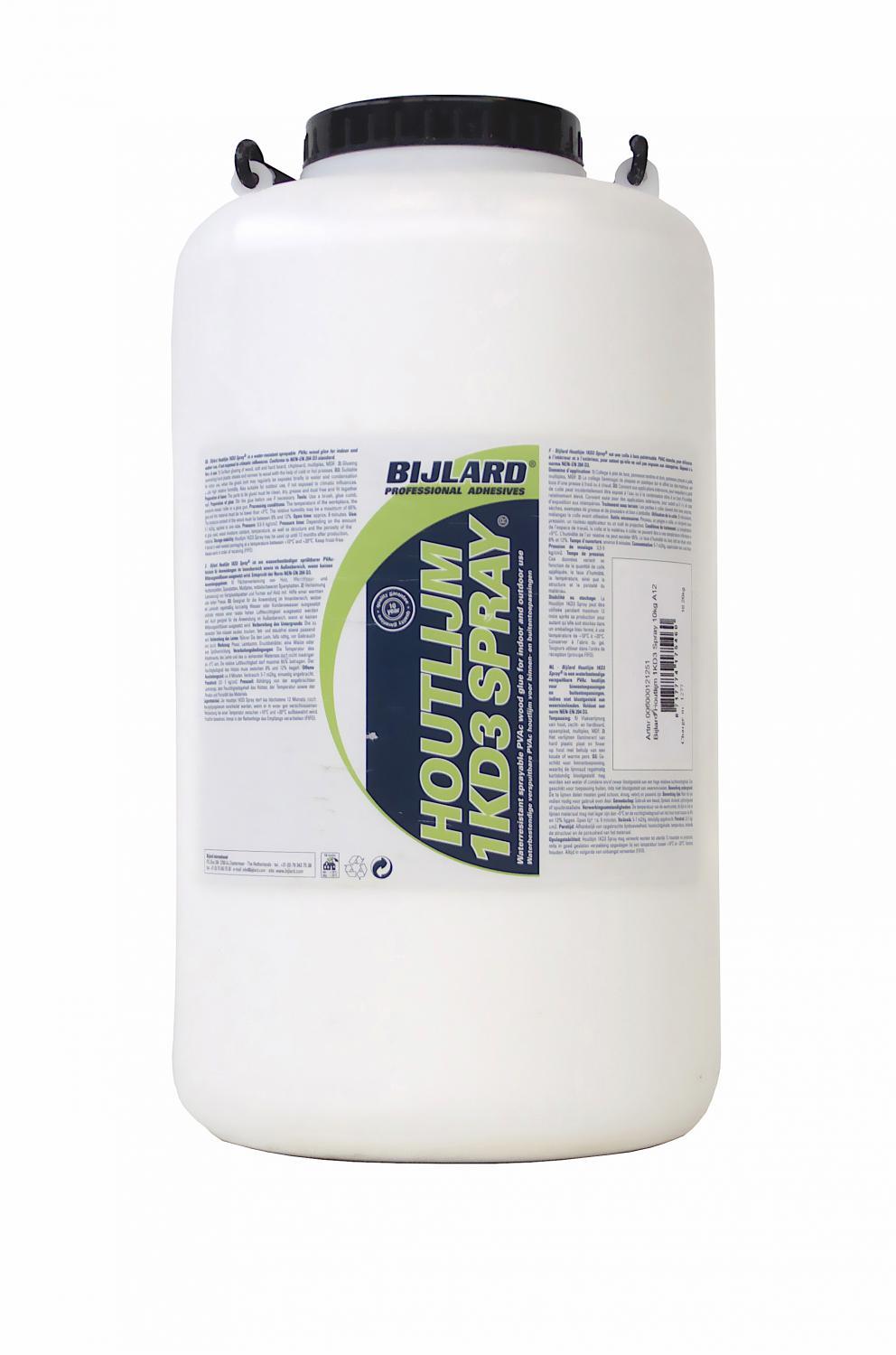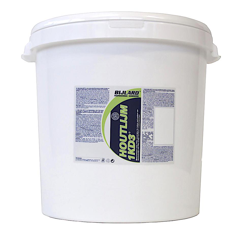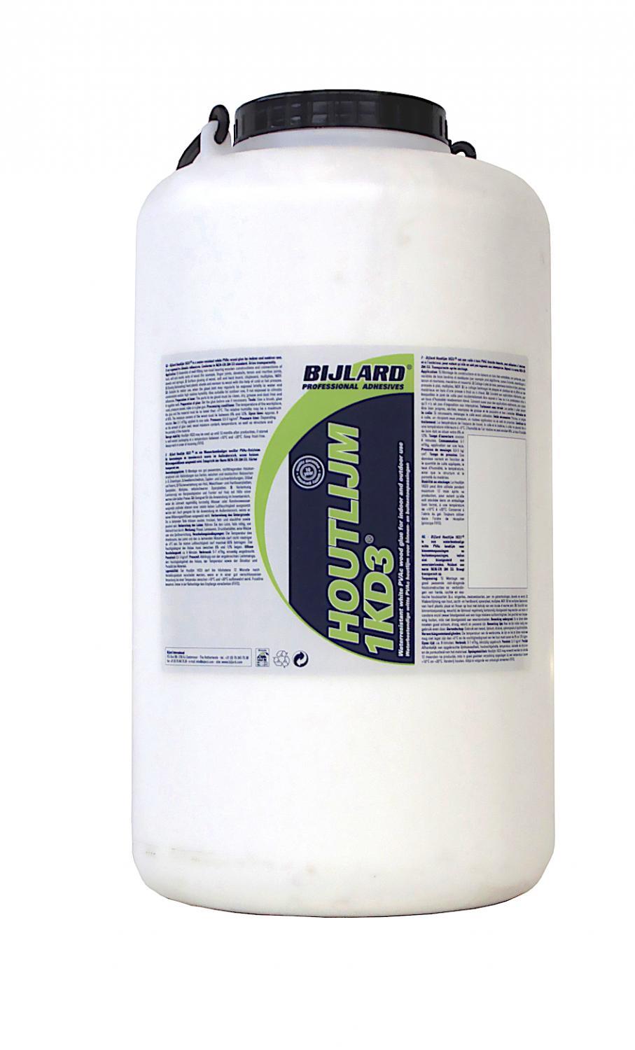 Bijlard Holzleim 1KD3 Spritzbar, 25 kg, weiß, Spritzbarer, wasserbeständiger, weißer Holzleim. Wasserbeständig nach EN-Norm 204 D3 (DIN 68602 B3). Nach Trocknung transparent. Ungefüllt. Auf PVAc-Basis. Öffnungszeit ± 10 Minuten. Presszeit 20 Minuten.