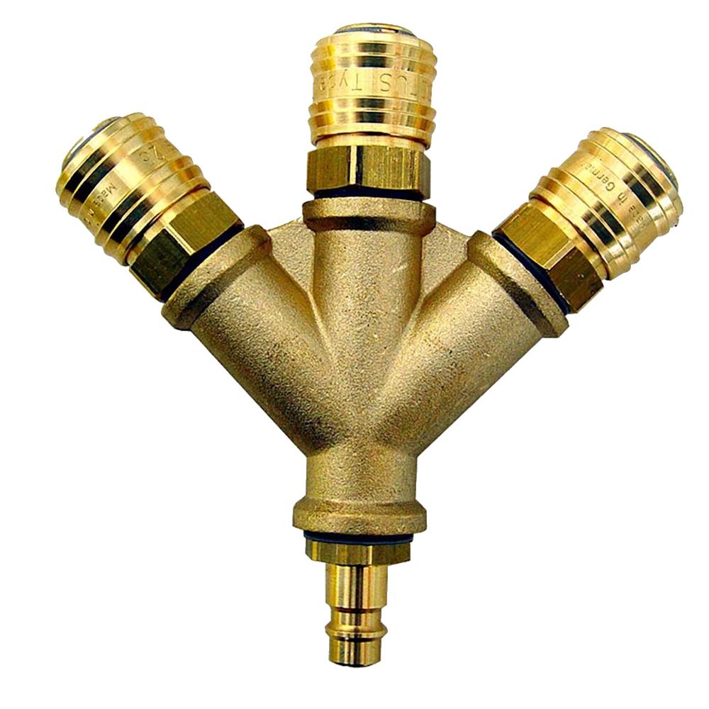 Verteiler für Druckluftschlauch mit 3 Abgängen, 3 Kupplungen & 1 Stecktülle, Messing, VE 1 Stück