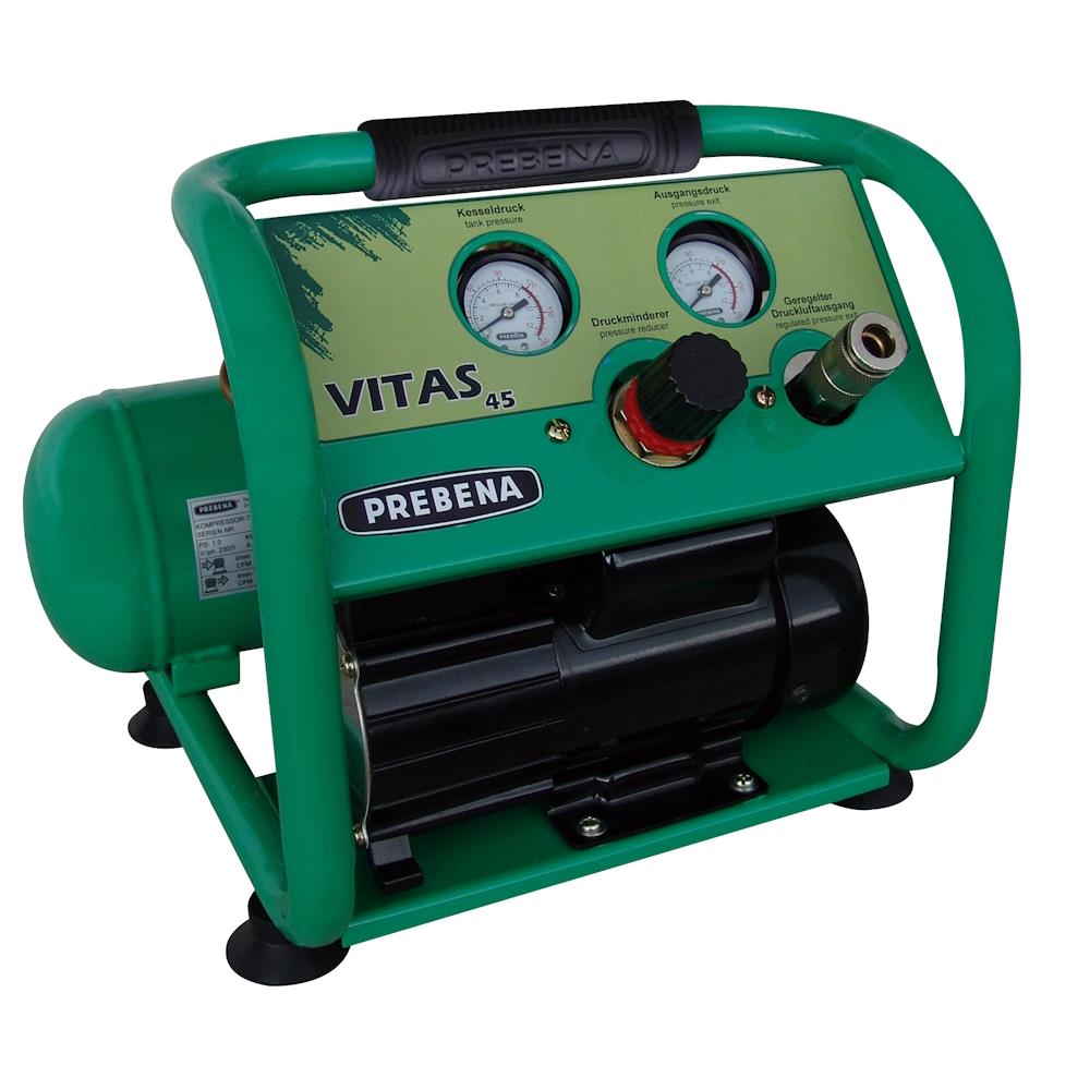 Prebena Kompressor Vitas 45, 41 l/min, 4 Liter, 10 bar, Kompressor für Druckluftgeräte, extrem handlich und außerordentlich leicht Kompakter Kolbenkompressor für den mobilen Einsatz, leistungsstärkster seiner Klasse, geschützte Armaturen, anwenderfreundliche Handhabung, einfacher Transport, nur 10 kg Gewicht, Versandgerechte Verpackung = für Paketdienst geeignet, Motor 230 V/250 W | Drehzahl 2840 U/min, Ansaugleistung 41 l/min | Füllleistung 24 l/min, Lautstärke 72 dB(A) | max. Druck 10 bar | Kessel 4 l, Gewicht 10 kg | L × B × H 370 × 310 × 300 mm | TÜV frei | ölfrei