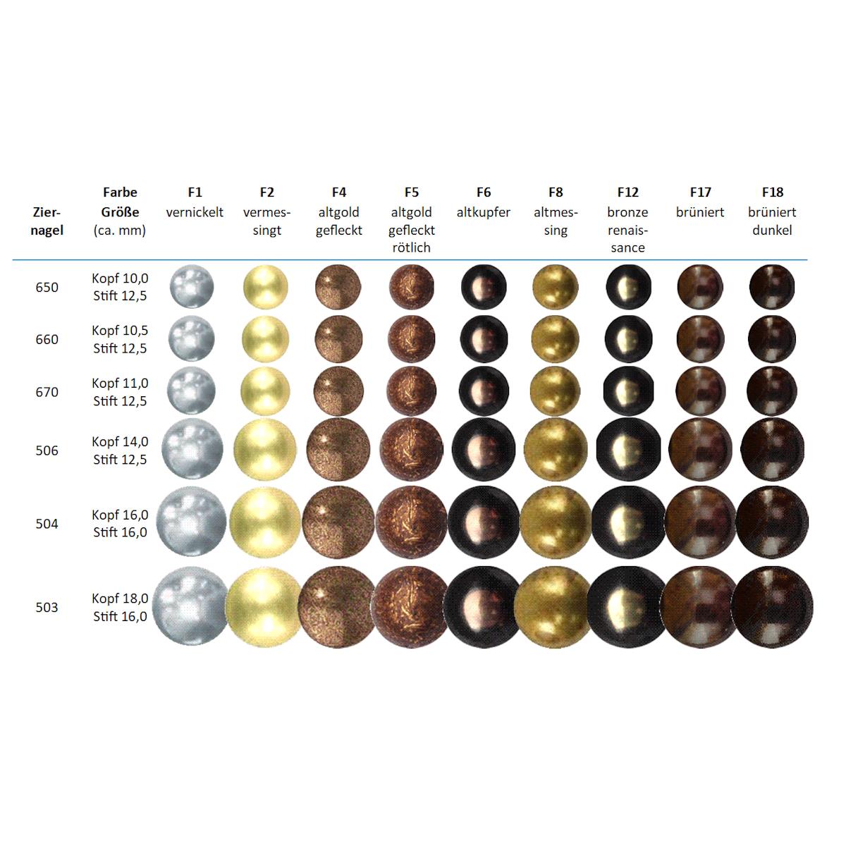 Ziernägel 650, F4 - altgold gefleckt (221), 1000 Stück, 10 mm, hoch gewölbt, Polsternägel aus Metall mit einem runden hoch gewölbtem Kopf, auch Möbelnägel genannt, Kopfdurchmesser ca. 10 mm, Stiftlänge ca. 12,5 mm
