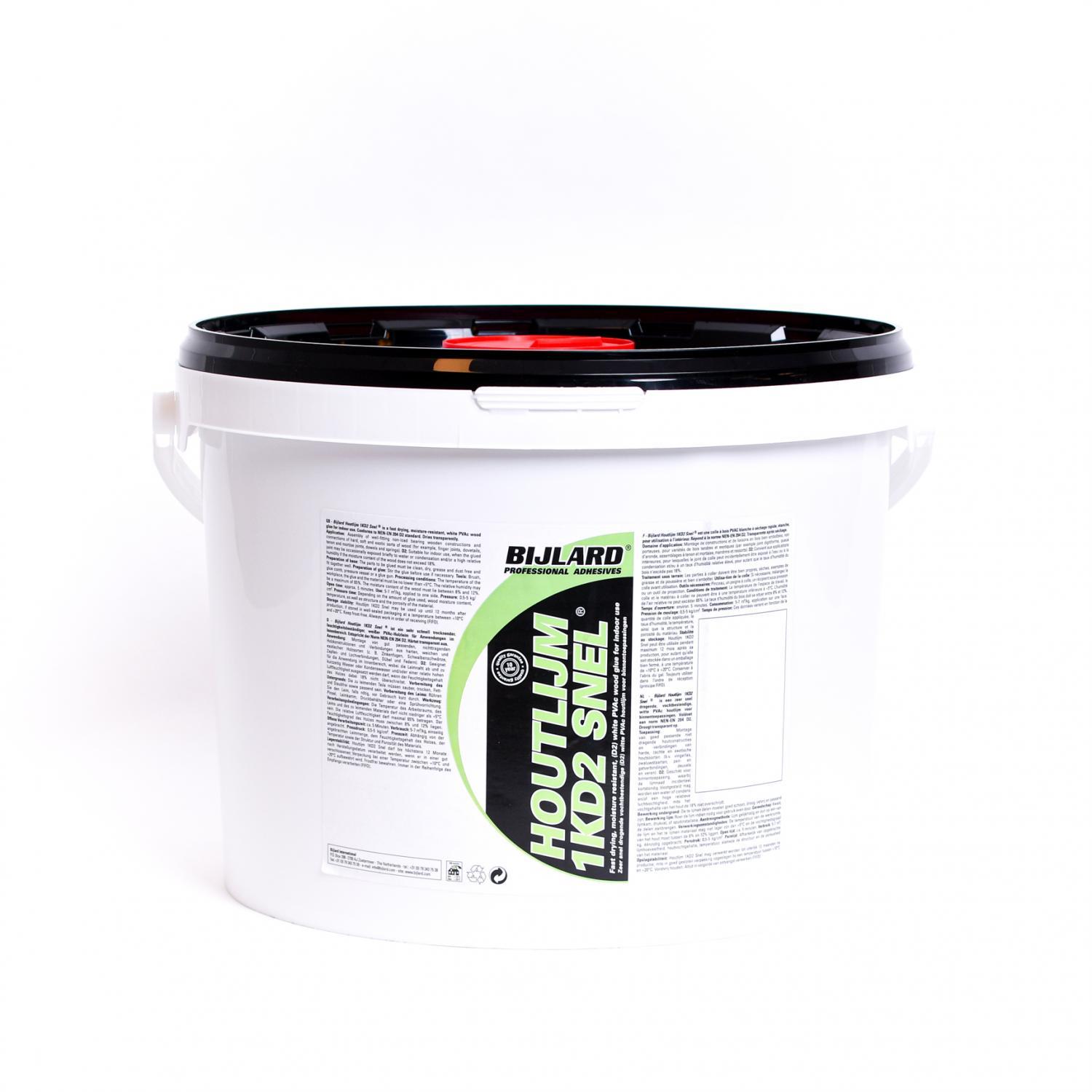 Bijlard Holzleim Schnell 1KD2 SNEL, 10 kg, weiß, Sehr schnell trocknender, feuchtigkeitsbeständiger, weißer PVAc-Holzleim für Anwendungen im Innenbereich. Entspricht der Norm NEN-EN 204 D2. Härtet transparent aus. Öffnungszeit ± 5 Minuten. Presszeit 5-10 Minuten.