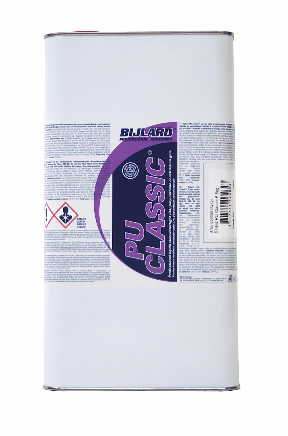 Bijlard PU-Classic, PUR-Leim, Dose 5,5 kg , Ist ein professioneller (salz)wasserfester Konstruktionsleim auf Polyurethanbasis. Entspricht der Norm NEN-EN 204 D4. Der leim härtet durch Reaktion mit Feuchtigkeit aus und bildet eine starke, haltbare und (salz)wasserfeste Verbindung. Eigenschaften: Basisgrundstoff: Polyurethanprepolymer. Viskosität: ca. 4000 mPas +20? Verarbeitungstemperatur : +5 C / +30 C. Dichtheit: 1,12 ±0,02 kg/m3 Endstärke: bei +20 C ca. 8-12 Stunden¹. Temp.beständ. nach dem Aushärten: -30 C / +90 C. Verbrauch : ca. 200-500 g/m². Haltbarkeit : kühl und trocken bewahren,+5 C/+25 C, 12 Monate Farbe : Leichtbraun Feststoffgehalt : 100%. Verdünnbarkeit: Leim nicht verdünnen. Pressdruck : 0-5 kg/cm², Pressdruck erhöht die Endstärke Scherfestigkeit : max. 80 kg/cm². Gefahrenpiktogramme: GHS 07: Reizend, sensibilisierend, schädlich | GHS 08: Langfristige Gesundheitsgefahr