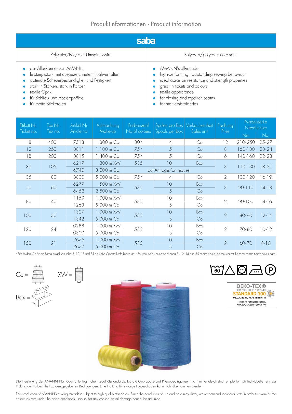 SabaTex 100, Bauschgarn, 5.000 m (Tex 35), weiß (1000), VE 1 Rolle(n), UV 5 Rollen, Nadelstärke Nm 90-110, Qualität von Amann-Mettler aus Deutschland. Polyester Multiflament, Bauschgarn, texturiert, für den Außenbereich