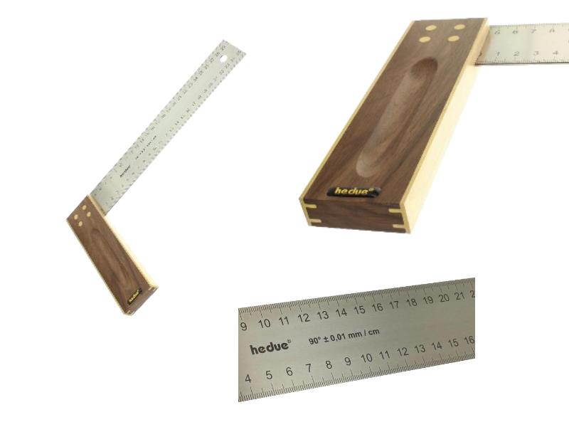 Schreinerwinkel mit Anschlag, 40 cm lang mit Nussbaumschenkel, Tischlerwinkel, Tischlerwinkel aus edlem Nussbaumholz mit Kalibrier-Zertifikat. Für diesen hochwertigen Tischlerwinkel verwenden wir edles Nussbaumholz. Der Nussbaum ist in ganz Europa heimisch und wächst an warmen Standorten. Typisch ist die lebhafte Maserung und die helle bis schwarzbraune Färbung. Nussbaum ist ein formstabiles Holz, das sich wenig verzieht und gut bearbeitet werden kann. Die Stahlzunge ist aus rostfreiem Edelstahl und mit einer abriebfesten Millimeterskala beschriftet. Nieten aus Messing und ein Messingbeschlag geben dem Winkel eine hochwertige Optik.Jeder Winkel wird auf eine Genauigkeit von mindestens 0,06 Grad kalibriert. Das Kalibrierzertifikat erhalten Sie durch scannen des QR-Codes am Winkel. Merkmale: Zunge aus rostfreiem Edelstahl, doppelte und beidseitige Millimeterskala auf dem Stahlblatt, Stabilität durch die 4-fach-Vernietung, erfüllt die Anforderungen der Britischen Standard-Norm BS3322, Griff aus Nussbaum. Technische Daten: Abmessungen 400 x 45 x 1,5 mm, Abmessung Griff 195 x 45 x 15 mm, Genauigkeit des 90 Grad-Winkels 0,06 Grad